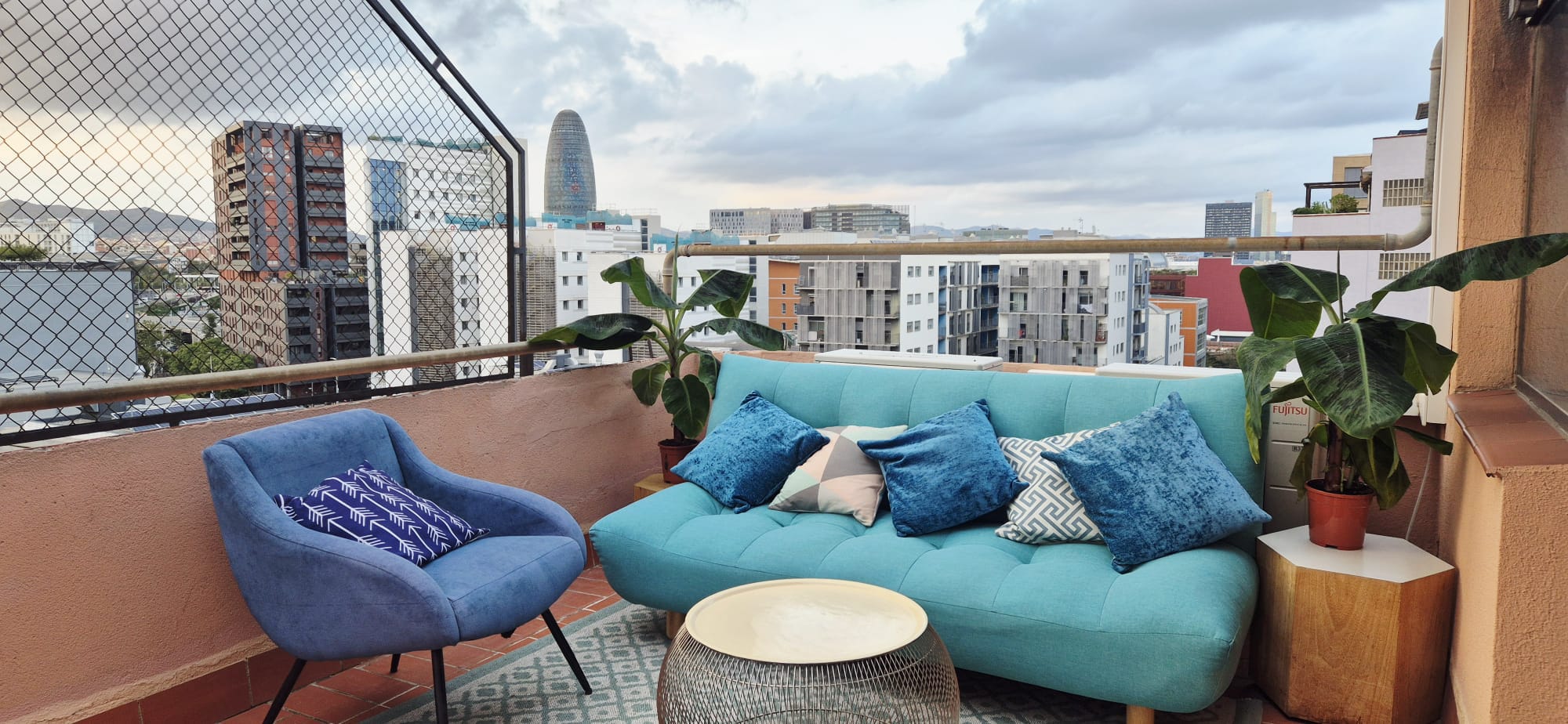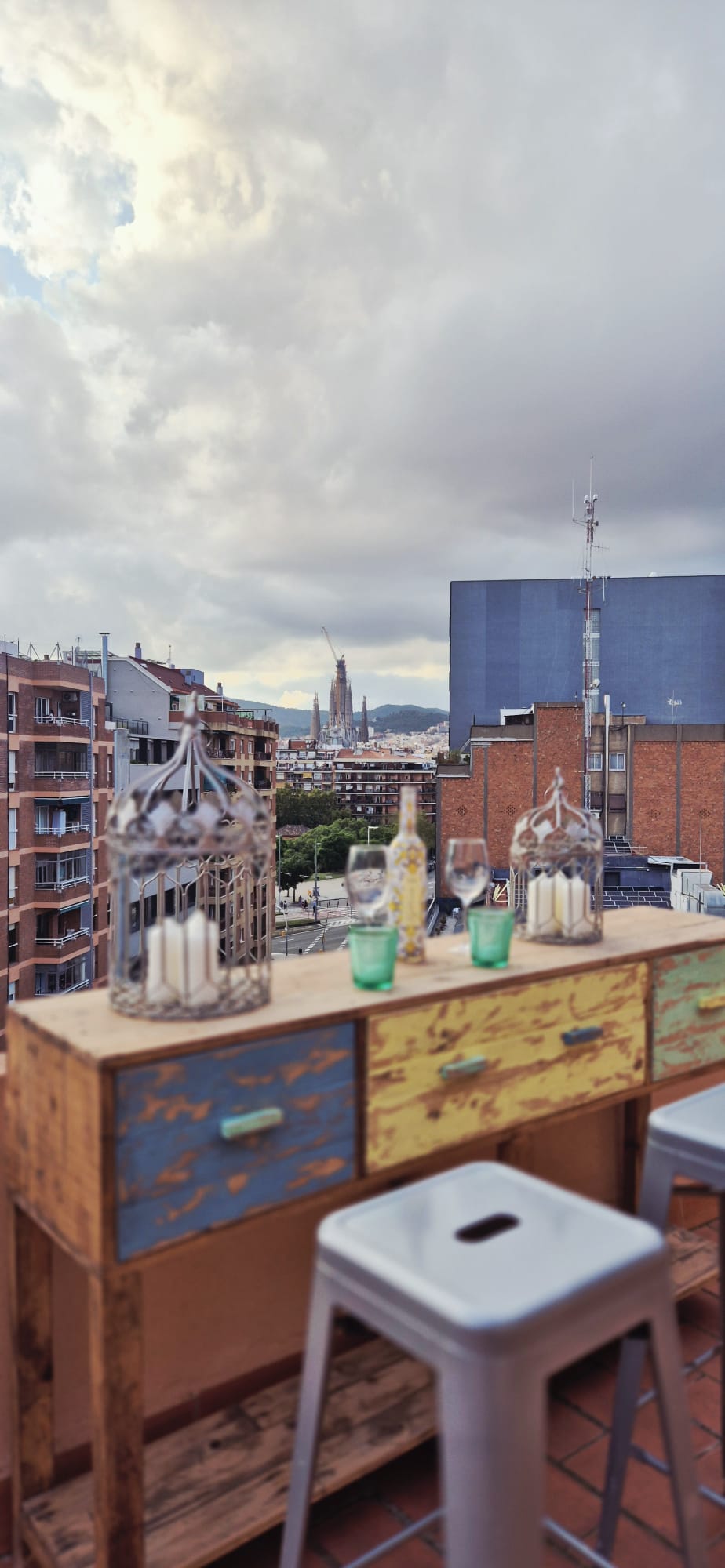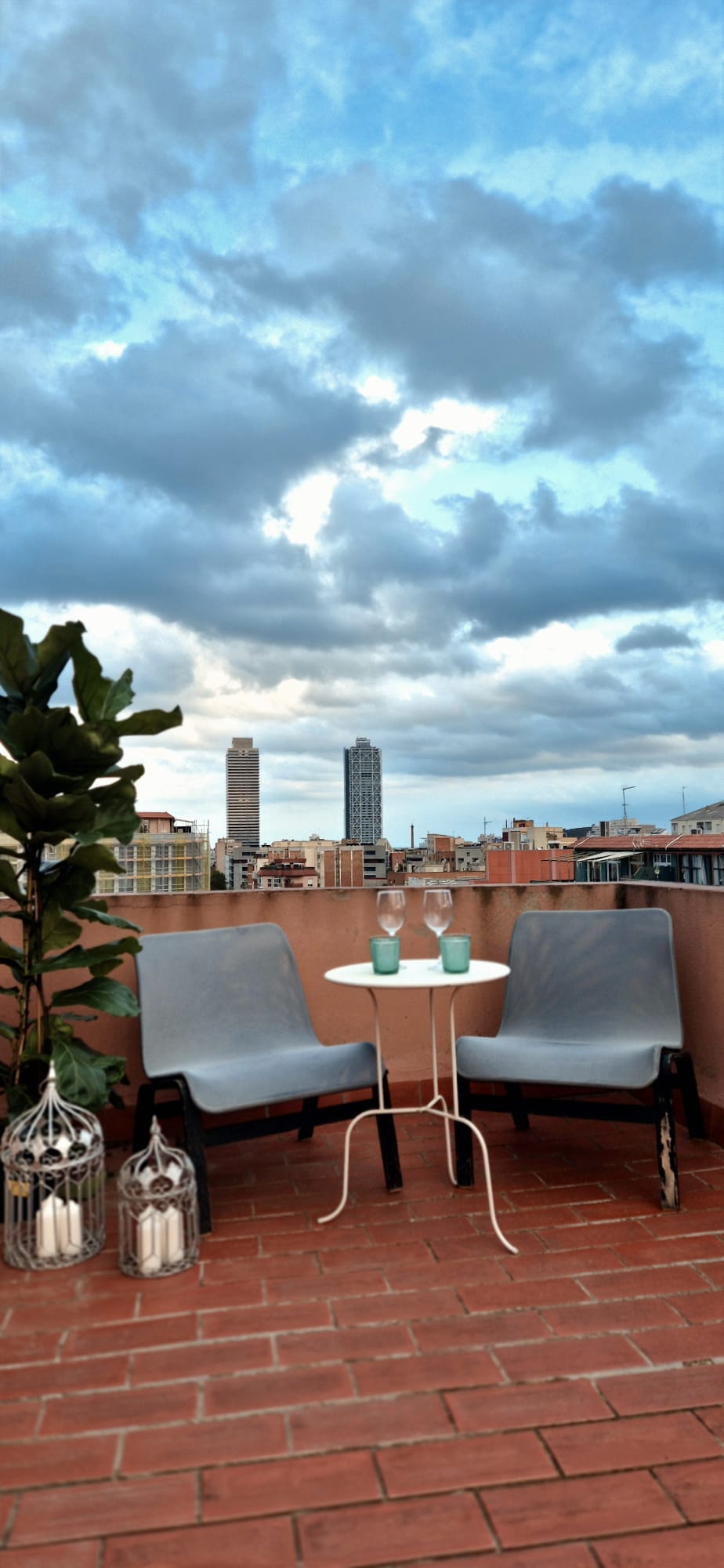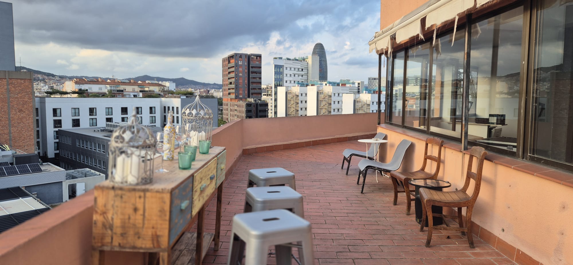 A wrap-around terrace facing Poblenou and the Barcelona skyline — perfect for receptions, cocktails and open-air sessions.